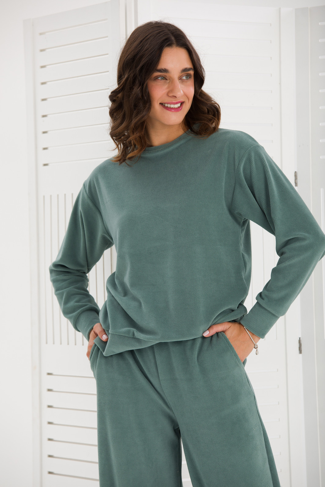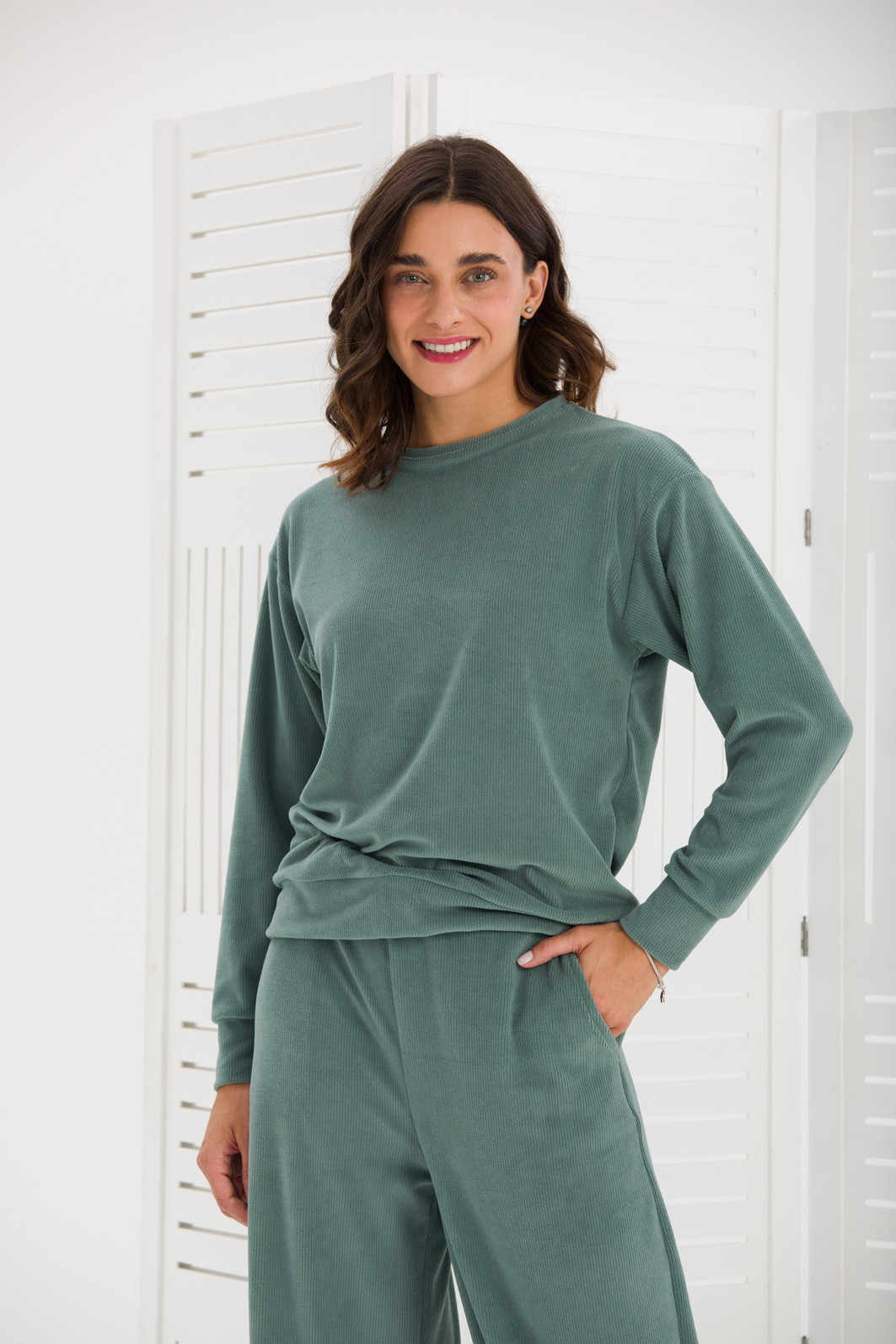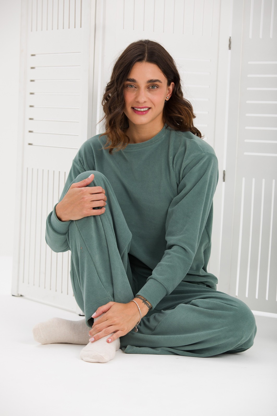 CONJUNTO MANGA LONGA MALHA CANELADA VELUDO VERDE