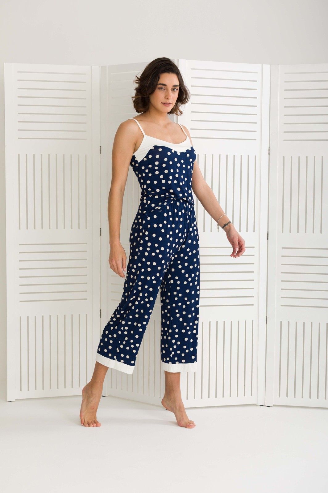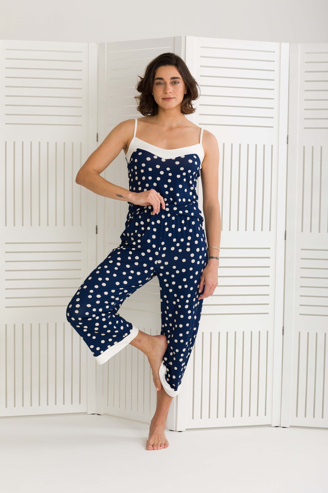 PIJAMA FEMININO DE ALÇAS COM CALÇA MIDI POÁ MARINHO