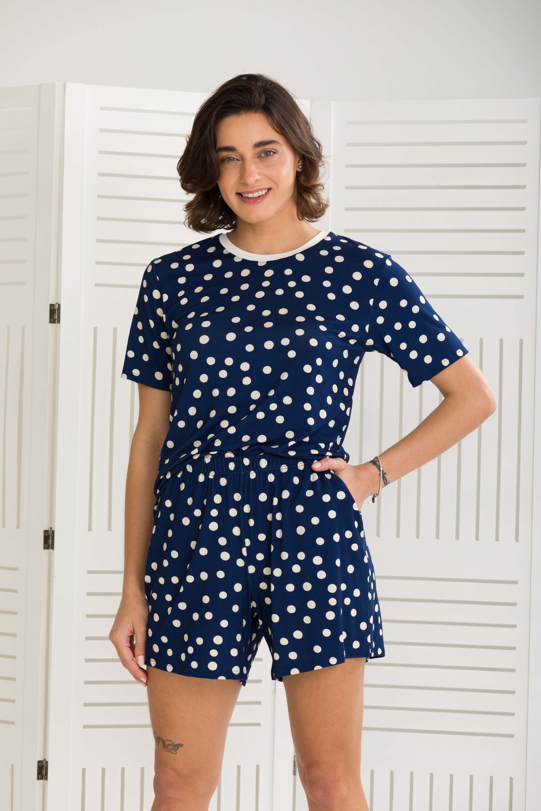 PIJAMA FEMININO MANGA CURTA COM SHOTS POÁ MARINHO