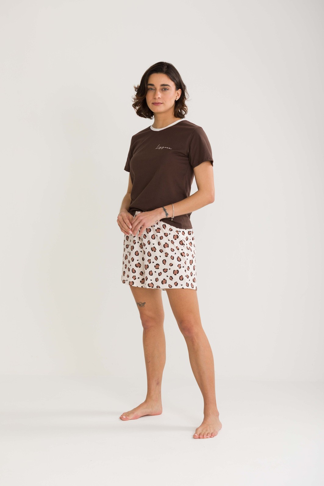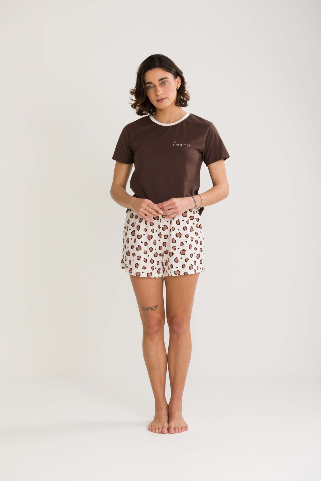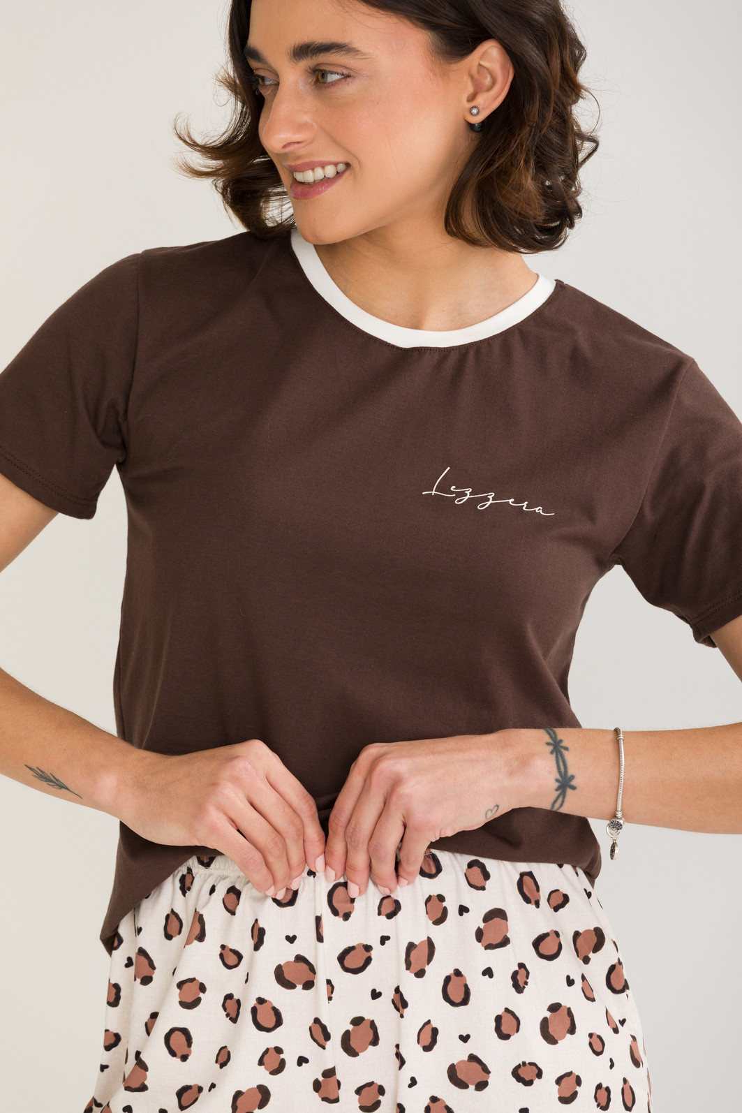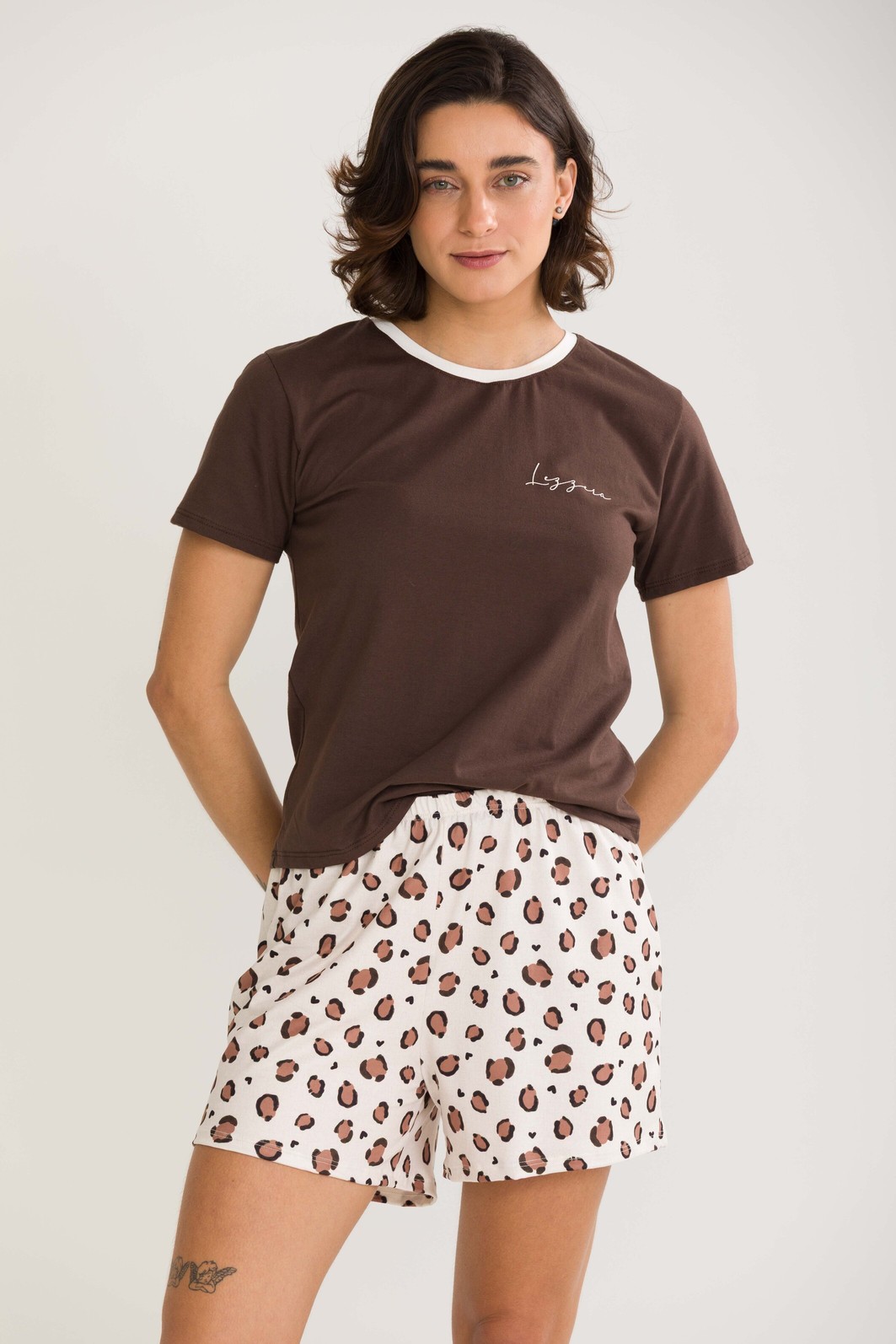 PIJAMA FEMININO MANGA CURTA MARROM E ONÇA