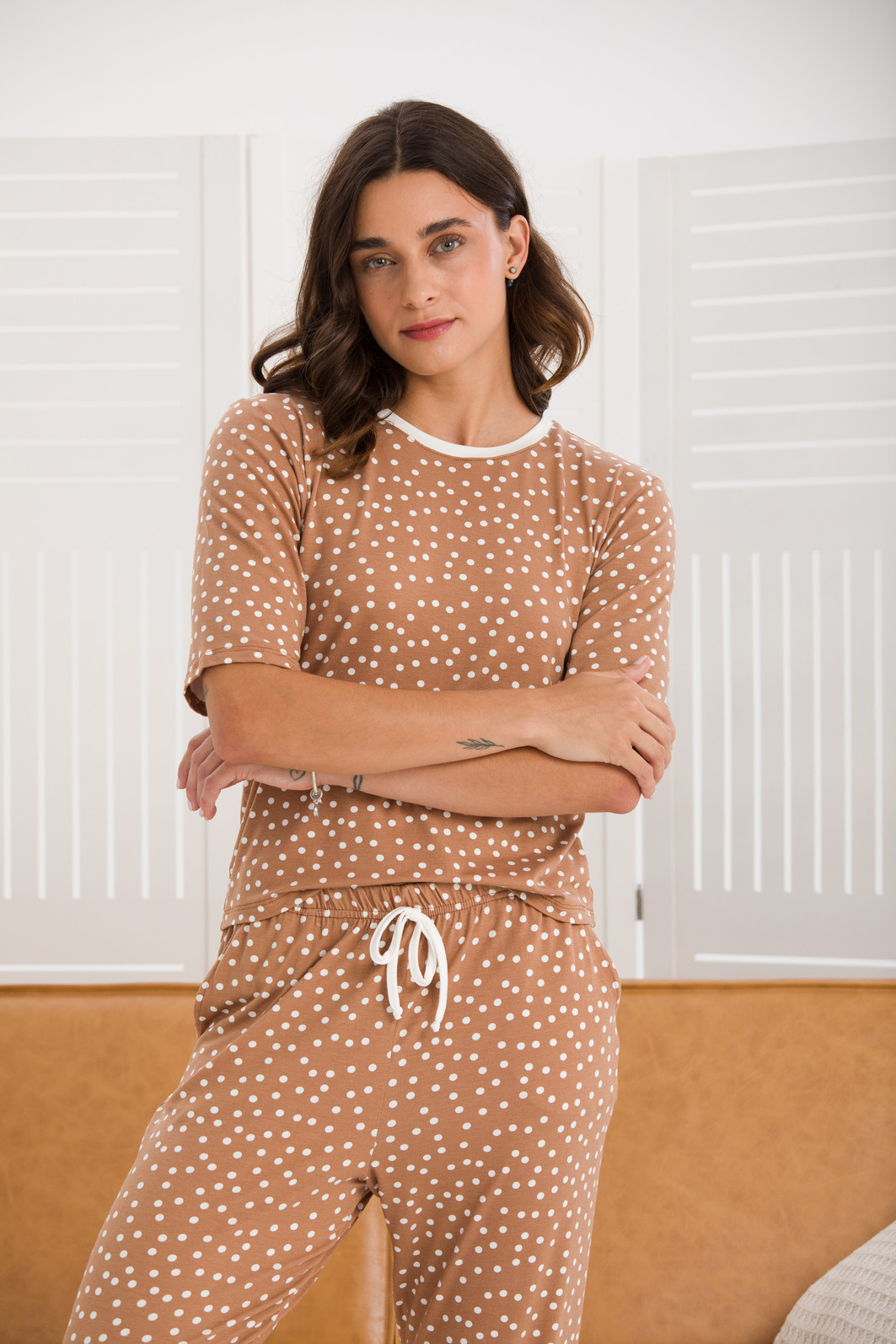 PIJAMA FEMININO MEIA MANGA POÁ CAMEL CALÇA COM BOLSO